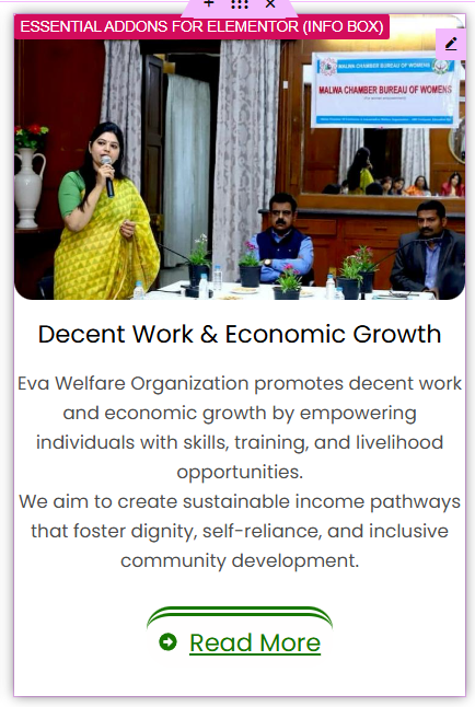 Eva Welfare Organization promotes decent work and economic growth by empowering individuals with skills, training, and livelihood opportunities.